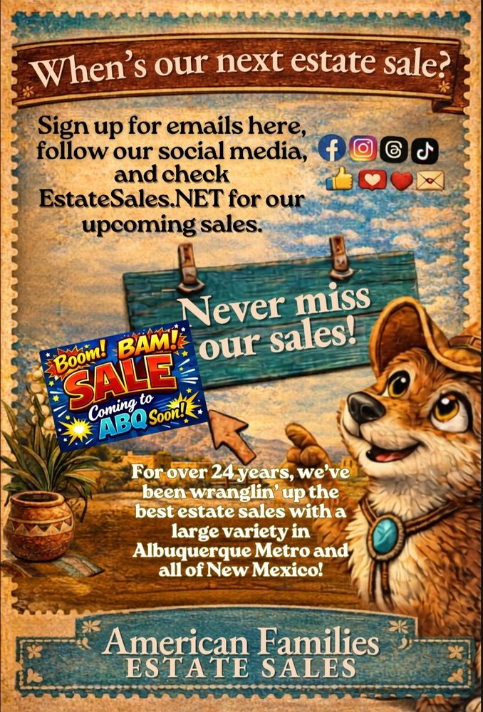 Dust off your shopping shoes and come see us this winter and spring 2026. There’ll be treasures to find all over the Albuquerque and NM area, stories to share, and plenty of smiles to go around. Join us at the next estate sale—where the fun starts at the front door. And be sure to keep up with us on social media, too!